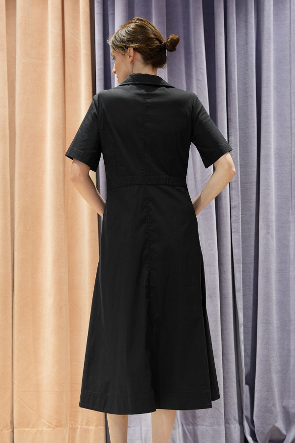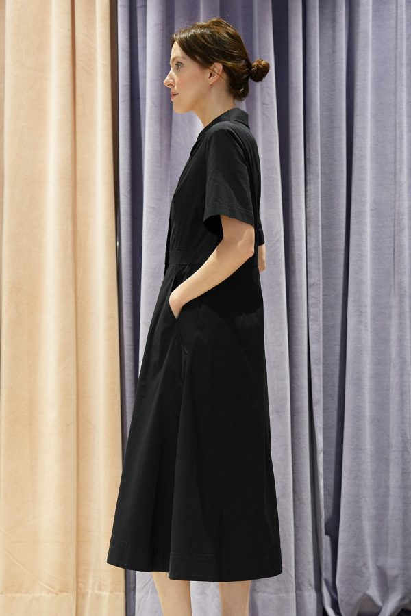 Zeitloses, schwarzes Hemdblusenkleid in Midi-Länge.