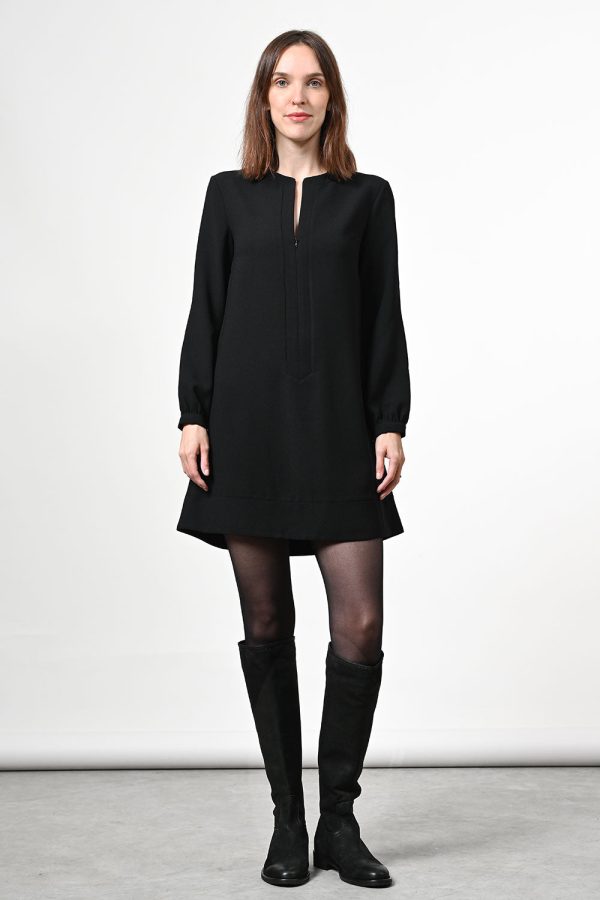 Schwarzes Kleid mit Reißverschluss am Ausschnitt.