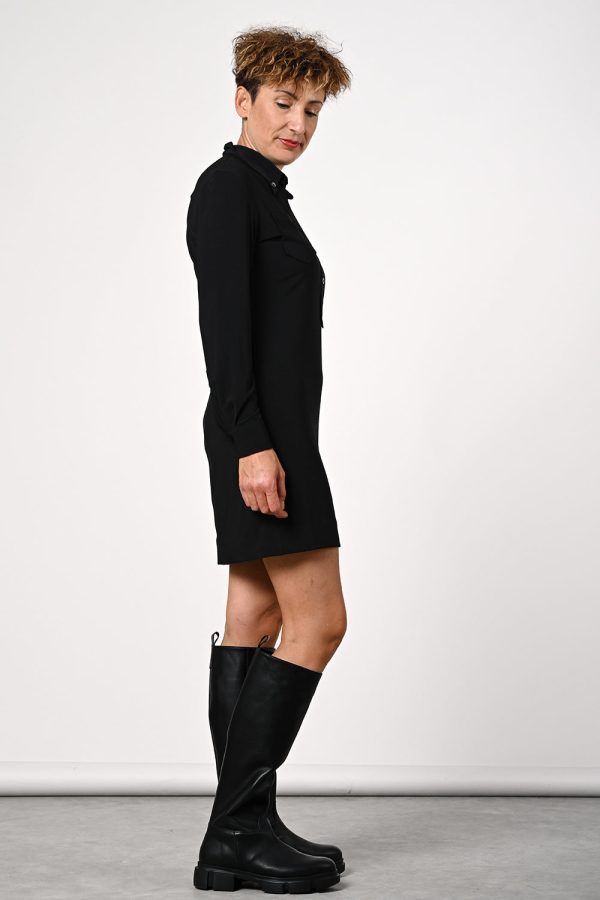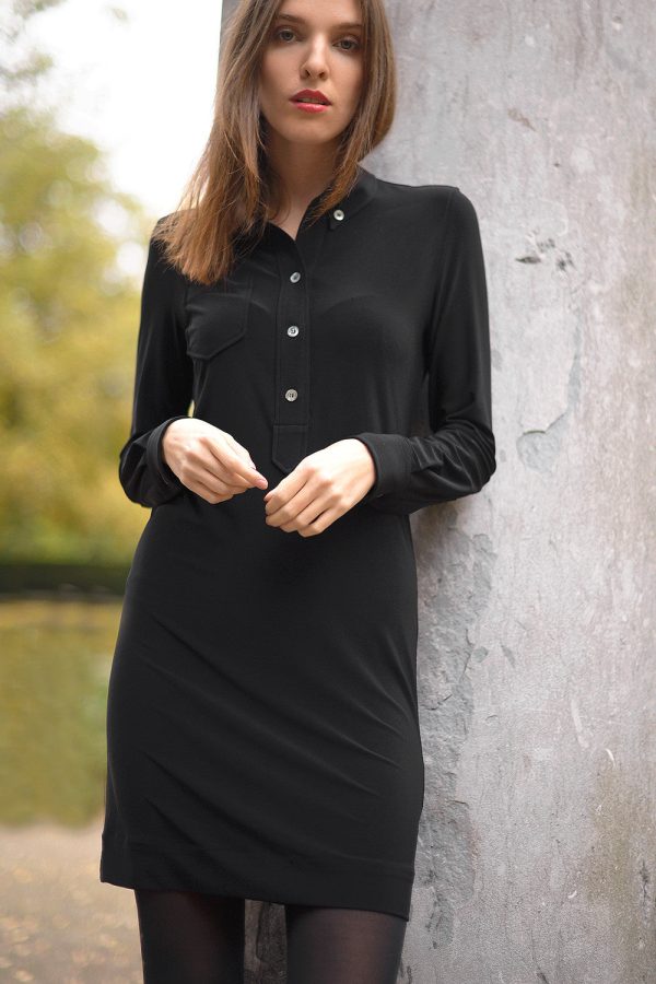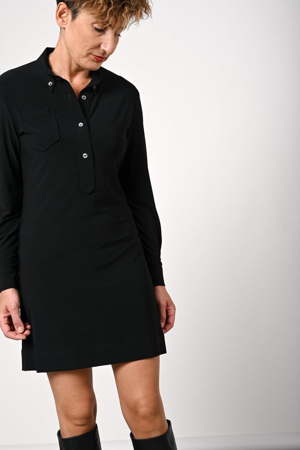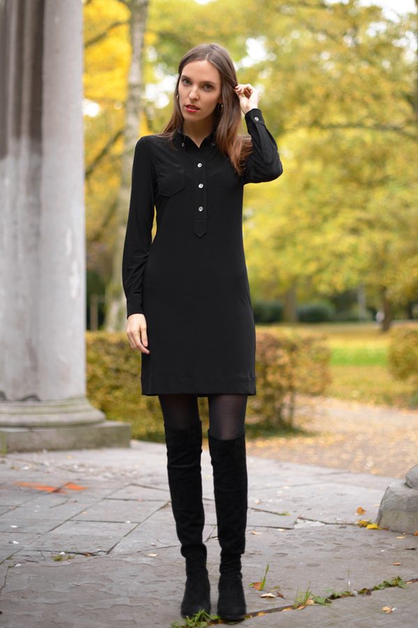Langärmeliges Polokleid im 70er Jahre Stil, mit aufgesetzter Brusttasche. Kann figurbetont oder auch weiter getragen werden.