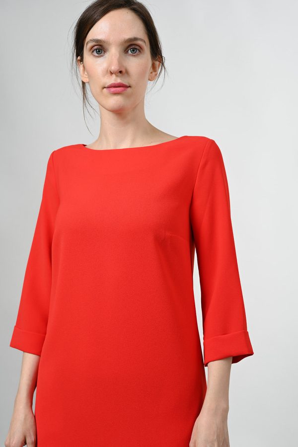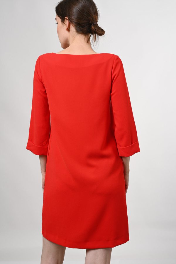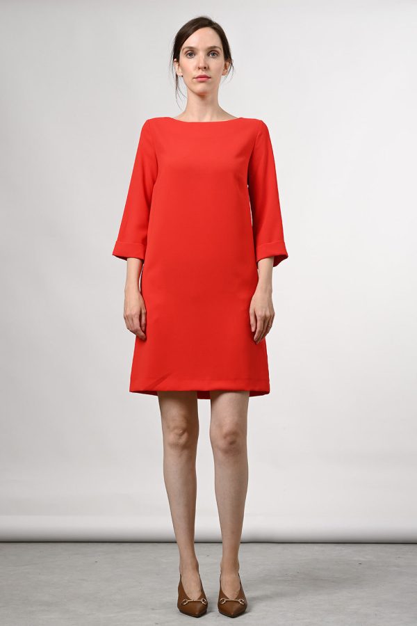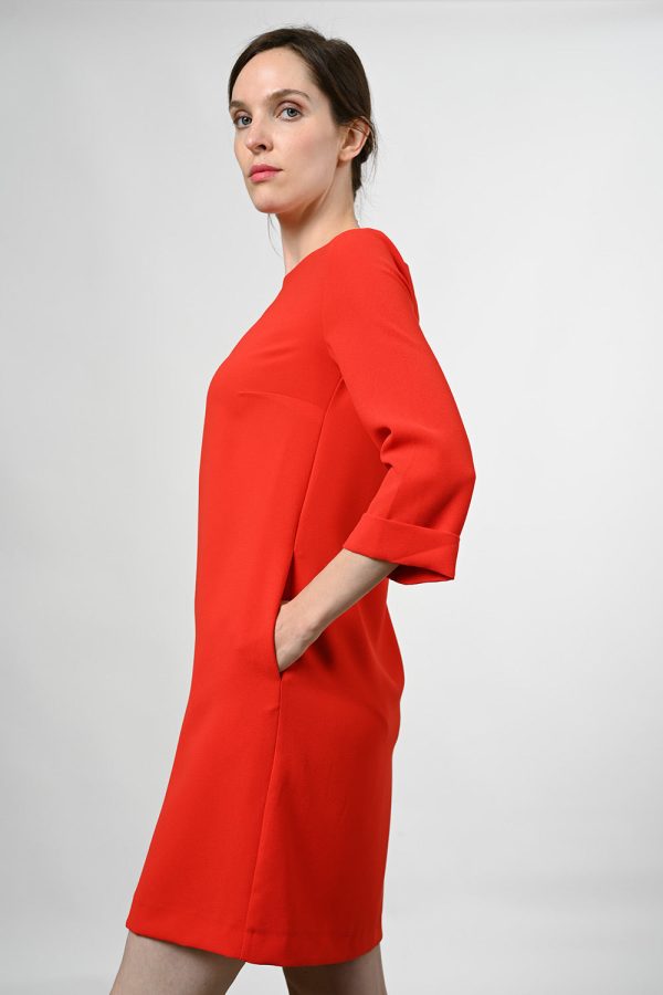 Zeitloses Damenkleid aus hochwertigem Krepp-Georgette in leuchtendem Rot mit eleganten dreiviertellangen Ärmeln für anspruchsvolle Trägerinnen.