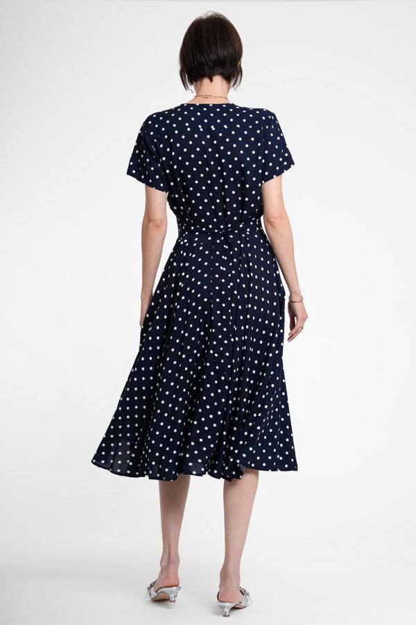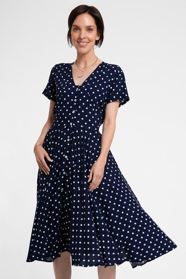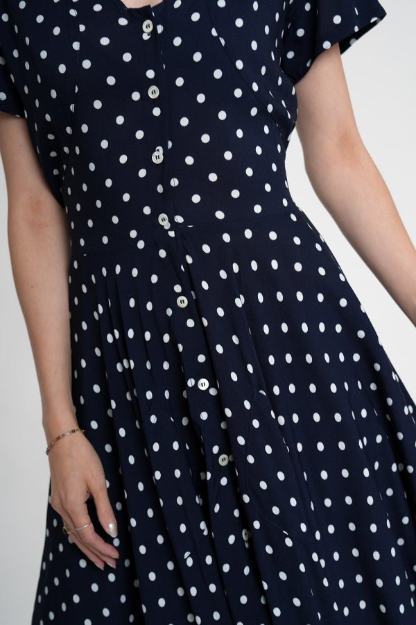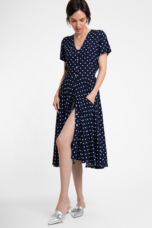 Bezauberndes Midi-Kleid in dunkelblauer Viskose mit weißen Punkten.
