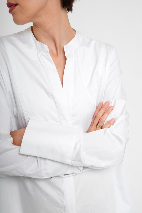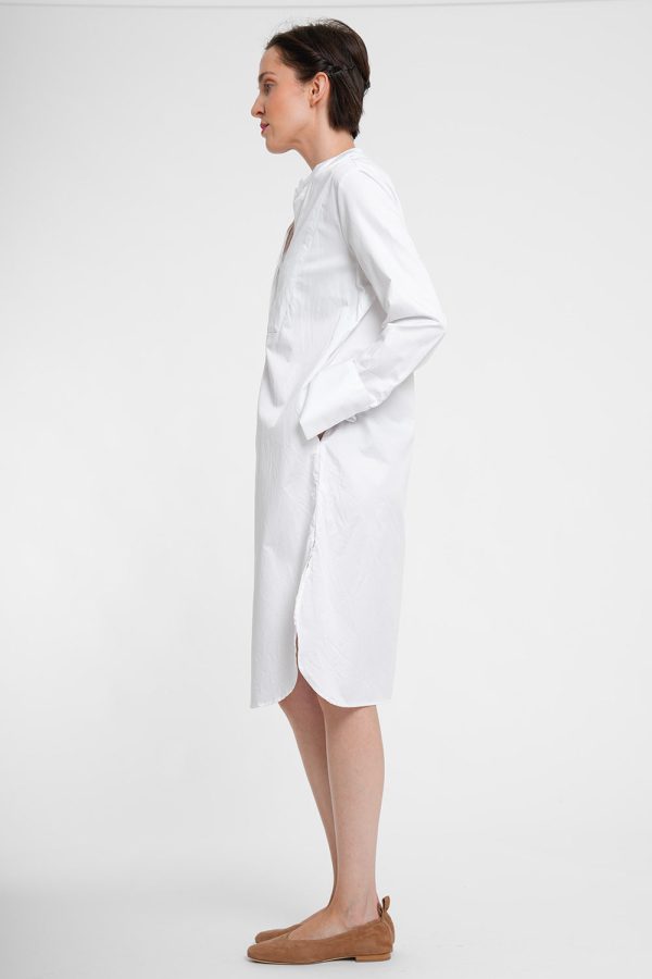 Zeitgemäßes Hemdblusenkleid aus hochwertiger Poplin-Baumwolle in reinem Weiß. Perfekt für den Business-Alltag und elegante Anlässe.