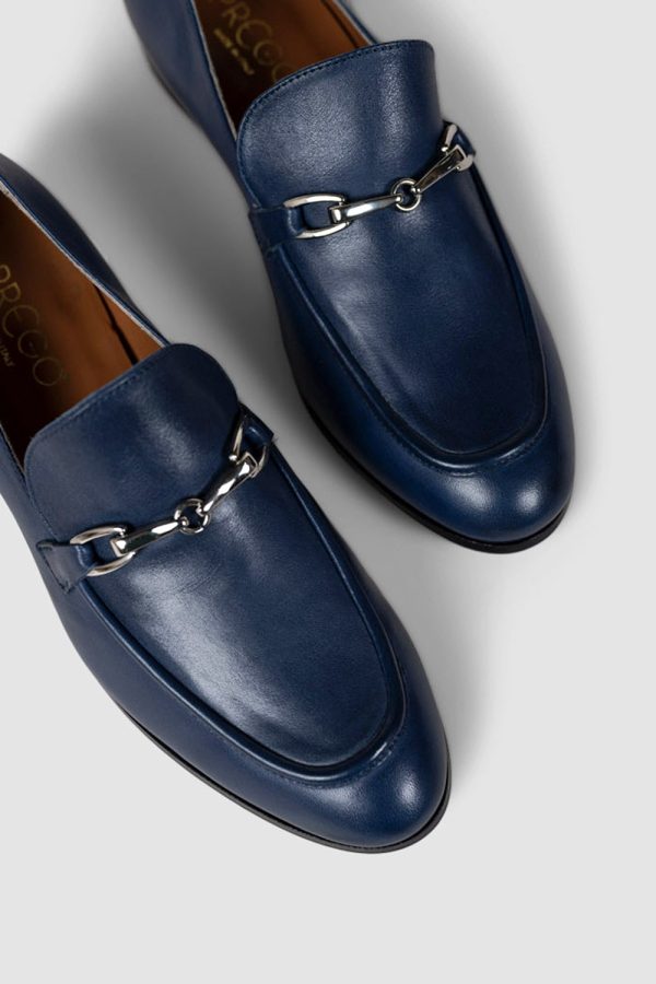 Flacher Loafer aus dunkelblauem Glattleder mit platinfarbener Schnalle.