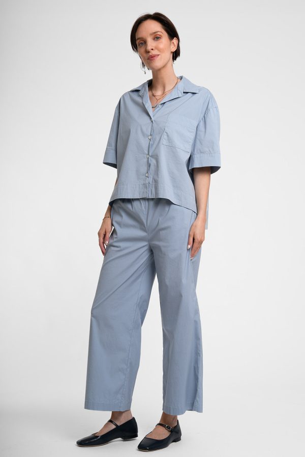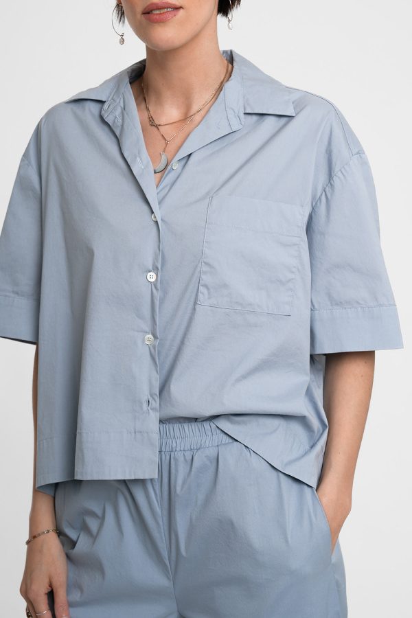 Elegante taubenblaue Bluse im kurzen Hemdenstil mit funktionaler Brusttasche.