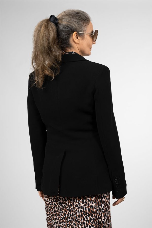 Eleganter, figurbetonter Blazer in klassischem Schwarz mit langem, ausdrucksstarkem Revers für einen professionellen Auftritt.