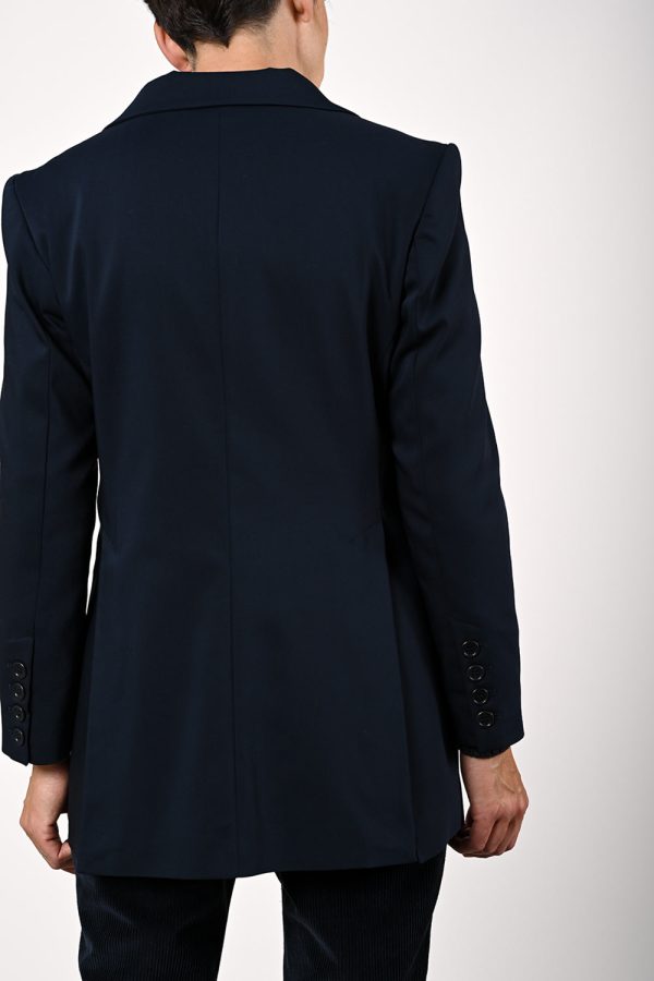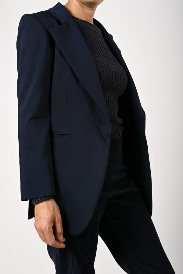 Dunkelblauer, taillierter Long-Blazer mit seitlichen Schlitzen.