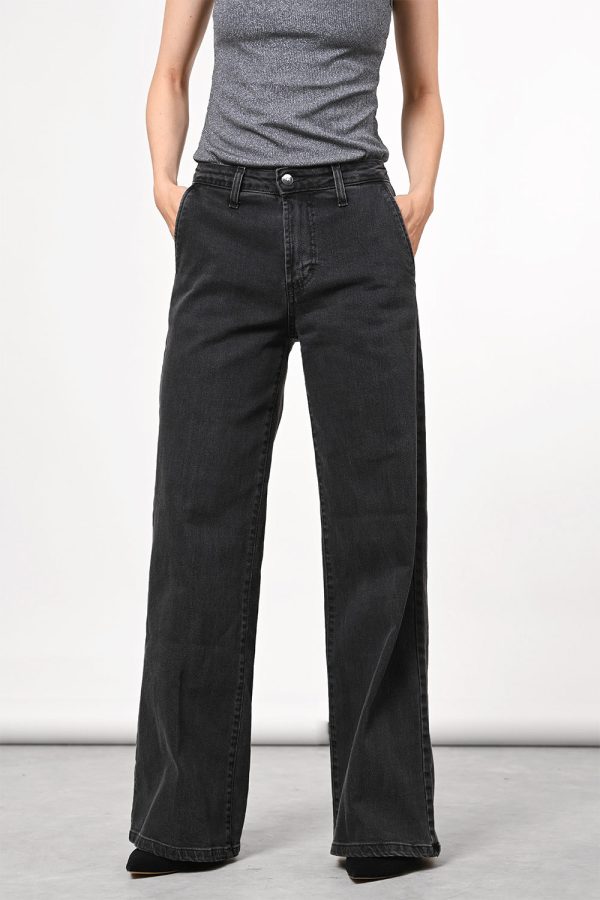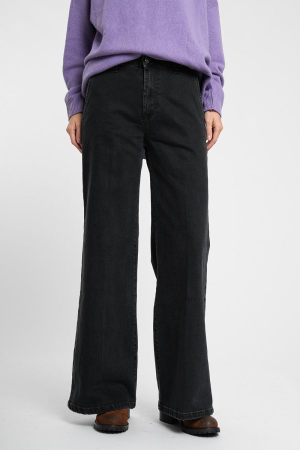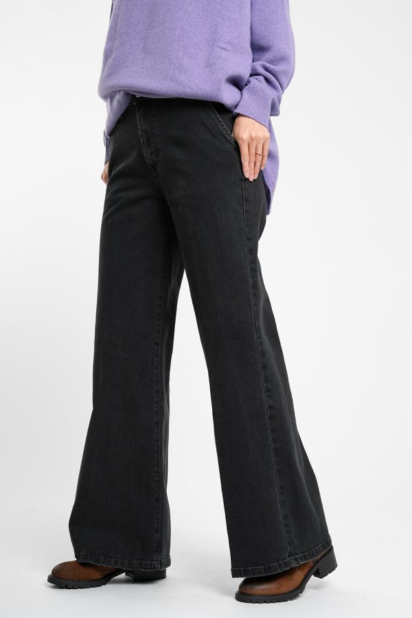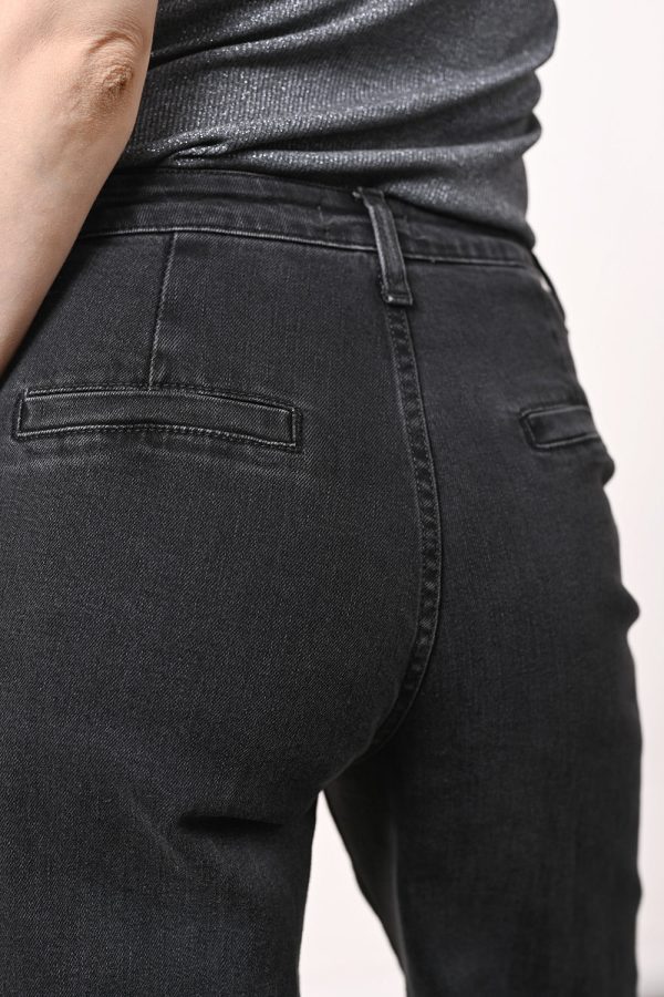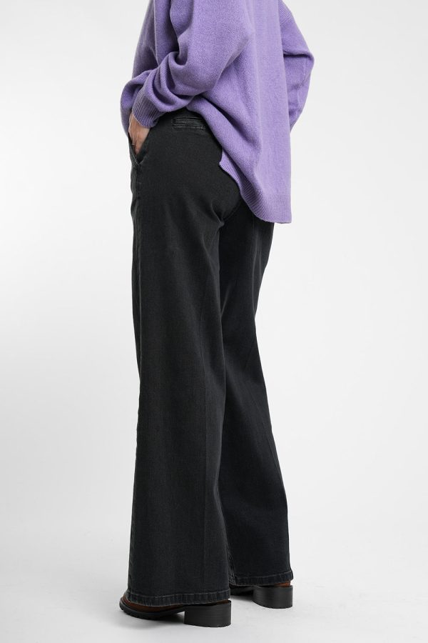 Dunkelgraue Jeans mit ausgestelltem Bein und Bügelfalten.