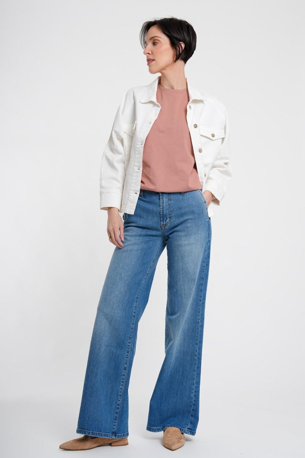 Hellblaue, gewaschene Jeans mit ausgestelltem Bein und Bügelfalten.