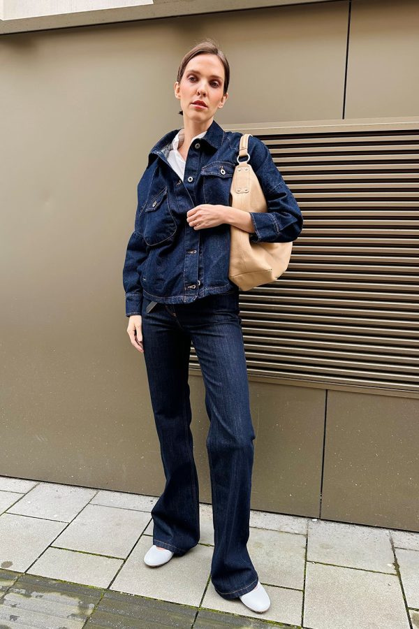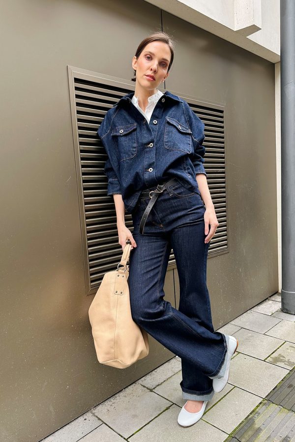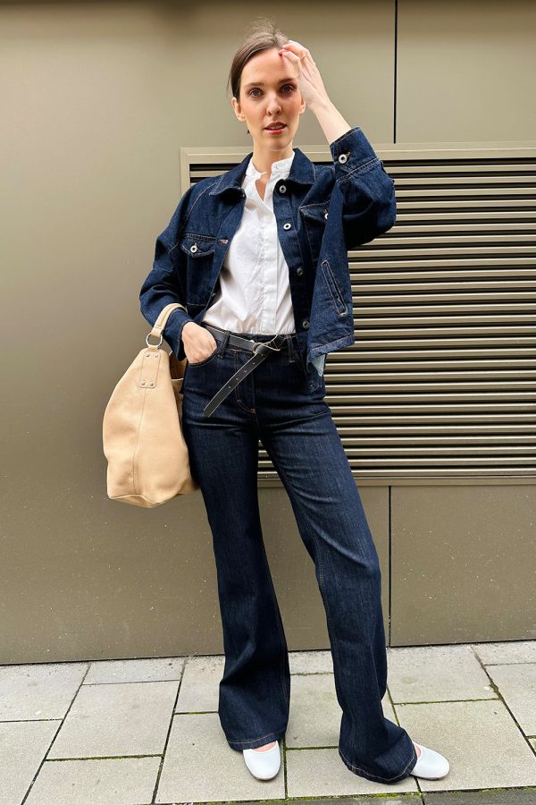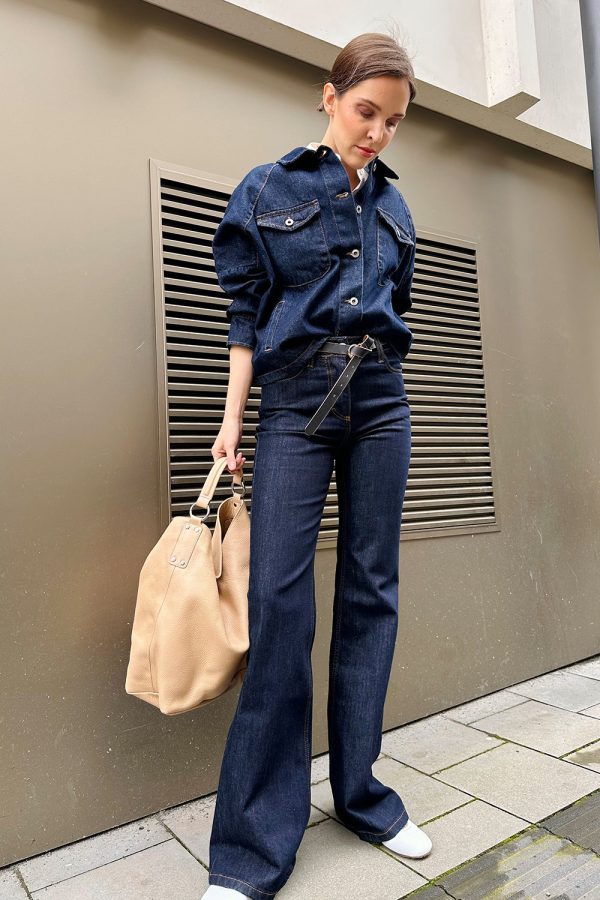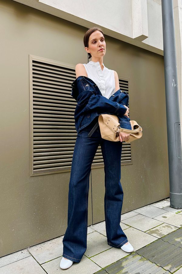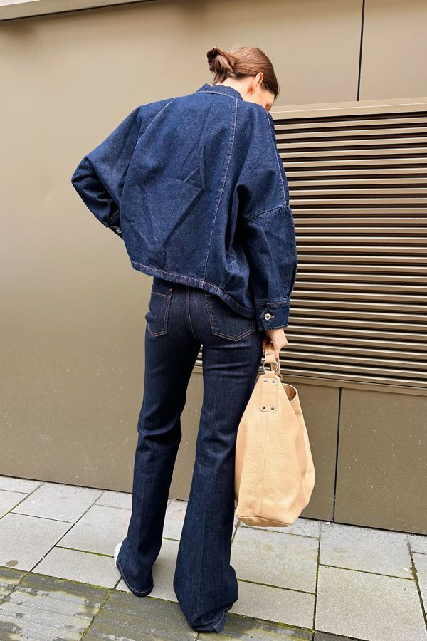 Dunkelblaue, hoch geschnittene Jeans mit ausgestelltem Bein.
