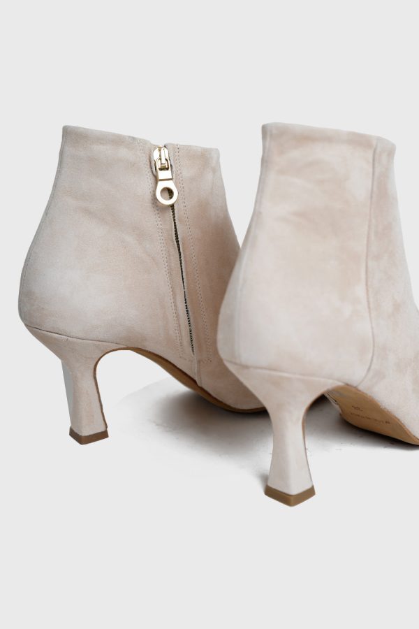 Beige, spitze Stiefelette aus weichem Veloursleder.