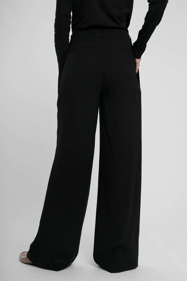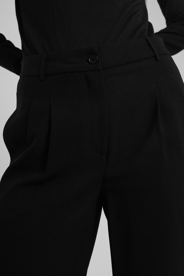 Schwarze Bundfalten-Hose mit ausgestelltem Bein und mittelhohem Bund.