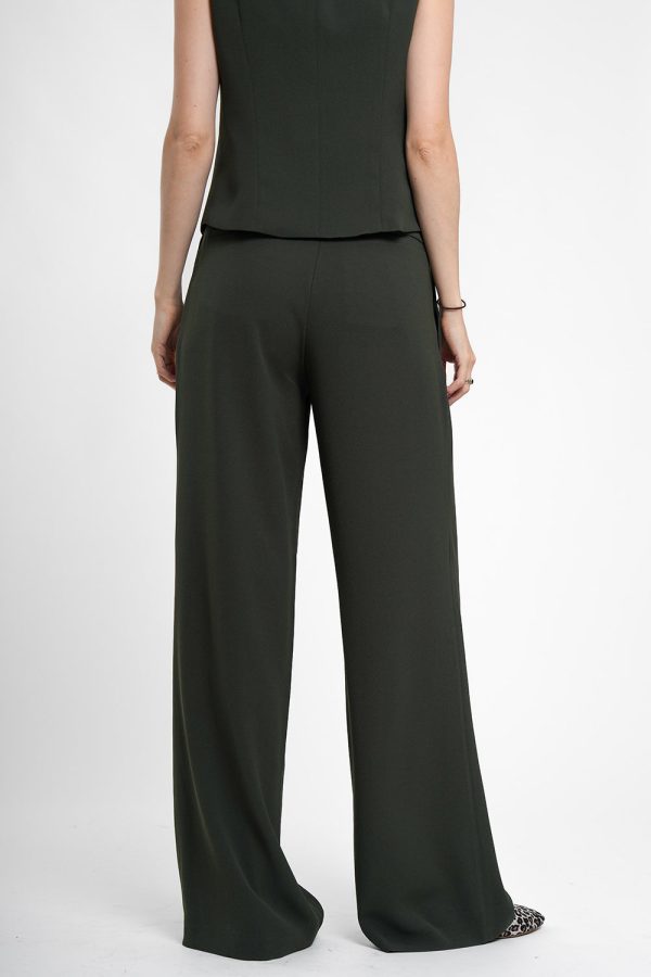 Olivfarbene Bundfalten-Hose mit ausgestelltem Bein und mittelhohem Bund.