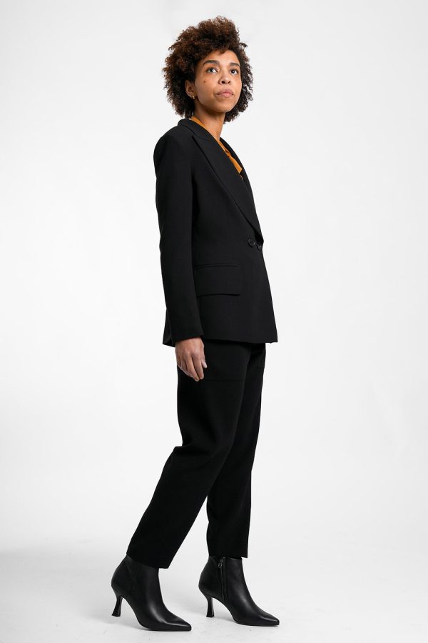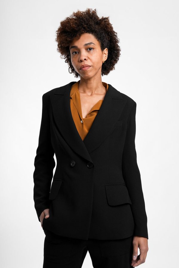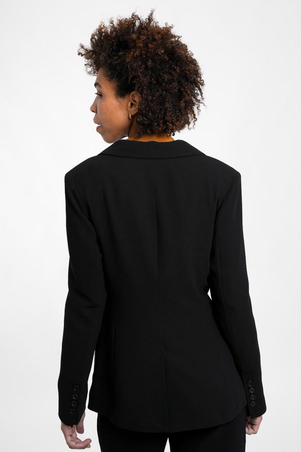 Eleganter, taillierter Blazer in klassischem Schwarz mit markantem Langrevers für einen zeitlosen Business-Look.