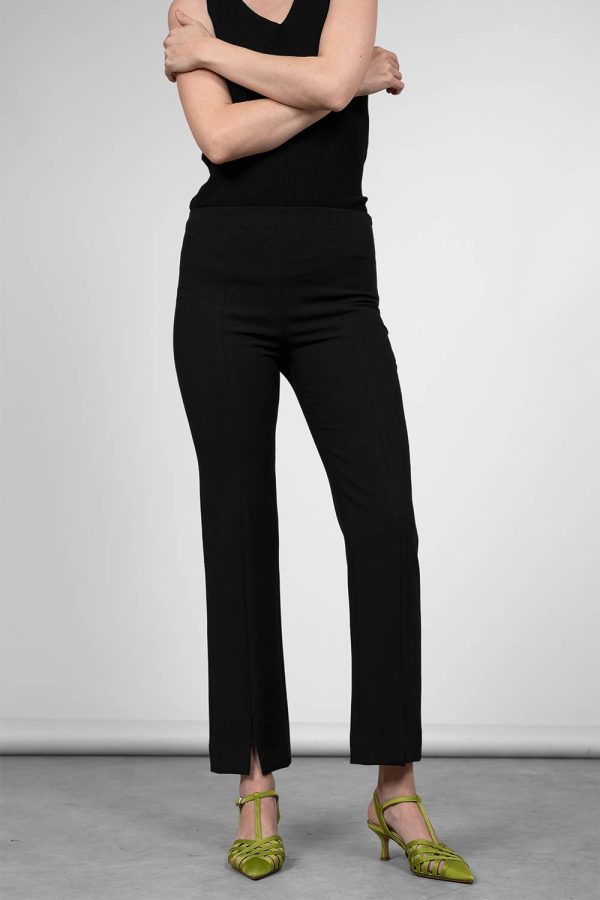 Schwarze Hose mit elastischem Bund und dekorativem Schlitz.