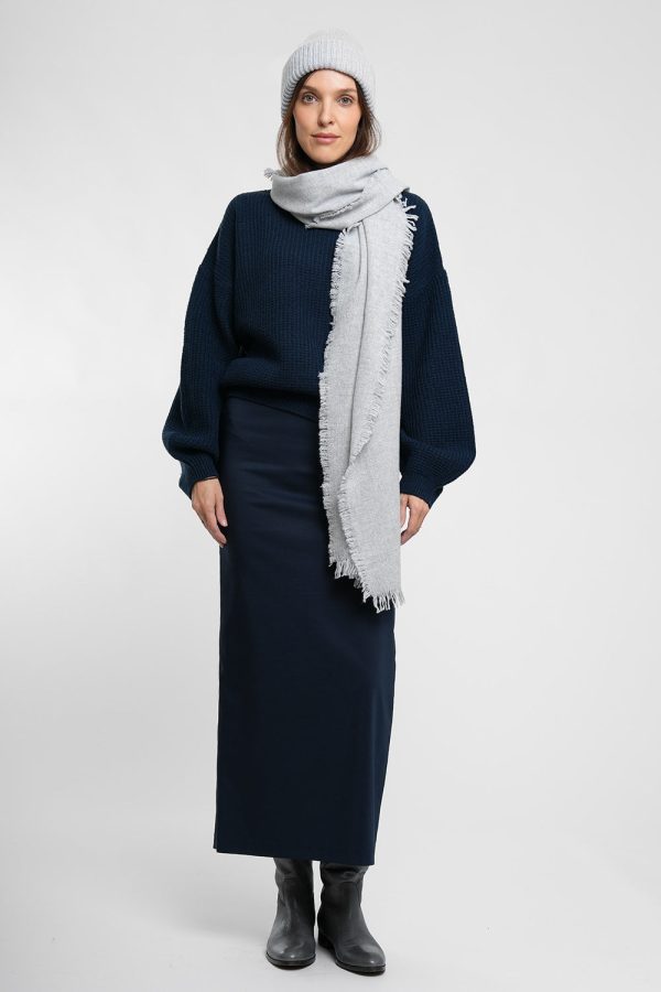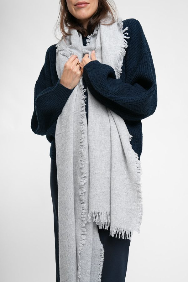 Langer Schal mit Fransen aus leichtem Kaschmir-Woll-Mix in Hellgrau.