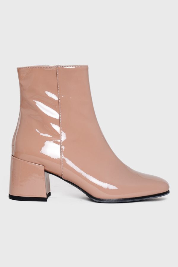 Moderne Stiefelette aus puderfarbenem Lackleder mit Blockabsatz.