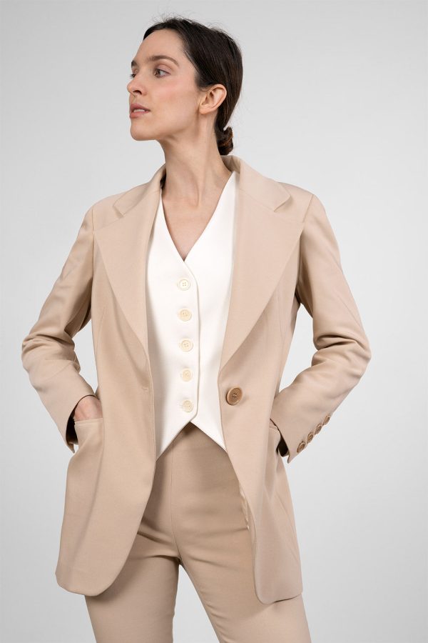 Cremefarbene Weste mit V-Ausschnitt aus Webstoff.